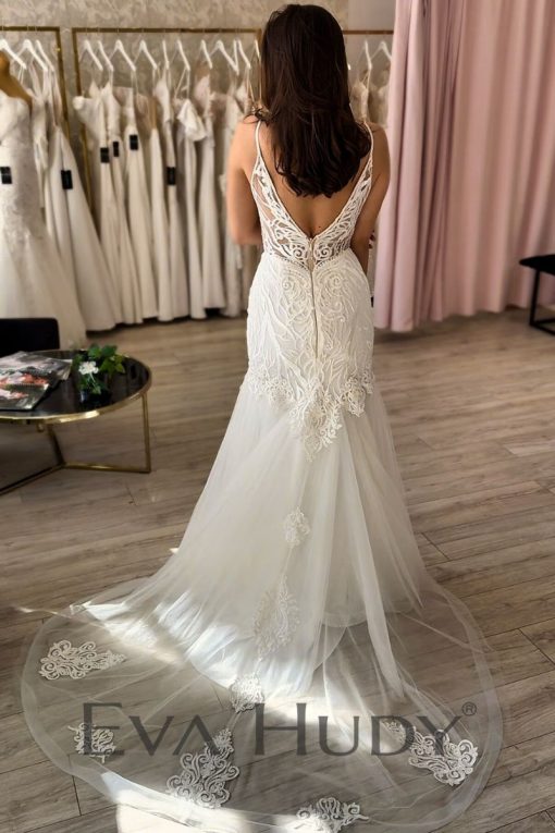 INGID to niezwykle elegancka, a jednocześnie romantyczna suknia ślubna o kroju rybki, która w perfekcyjny sposób łączy klasyczną kobiecość z subtelnym wdziękiem. Zaprojektowana z myślą o pannach młodych, które pragną wyglądać zjawiskowo, ale jednocześnie nie rezygnować z delikatności i romantycznego charakteru stylizacji. Wykonana jest z misternie zdobionej koronki, która pięknie przylega do ciała, tworząc niebanalny efekt. Idealnie dopasowana do sylwetki, suknia eksponuje kobiece kształty, wydłużając optycznie sylwetkę i nadając jej smukłości. W okolicach kolan suknia zaczyna się rozszerzać w dół, przechodząc w lekki, tiulowy dół o miękkim i romantycznym charakterze. Tiul wprowadza lekkość i delikatny ruch przy każdym kroku, stanowiąc piękny kontrast do bardziej strukturalnej, koronkowej góry. To zestawienie materiałów tworzy wyjątkowy efekt – zmysłowy, a zarazem subtelny i niezwykle kobiecy. Całość dopełnia przepiękny, ozdobny tren, który stanowi prawdziwą ozdobę tej kreacji.