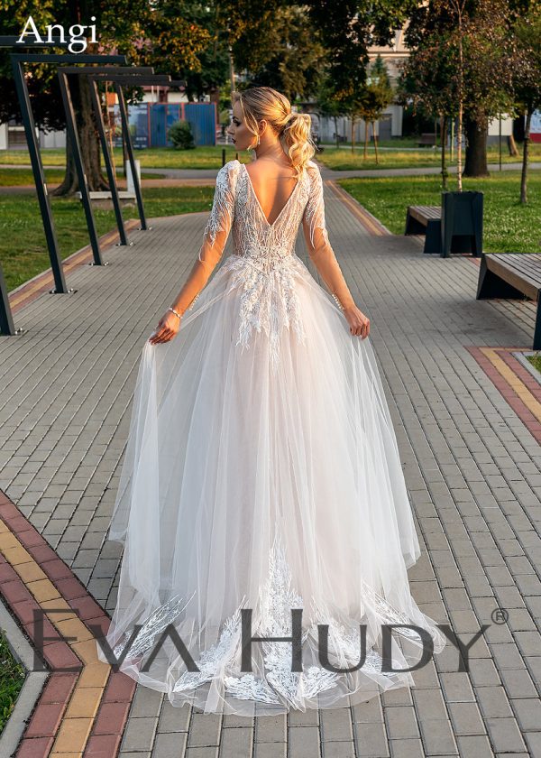 Romantyczna księżniczka z długimi, rękawami ozdobionymi fantazyjną koronką. Dodatkowym autem jest bogato zdobiony, podpinany tren.