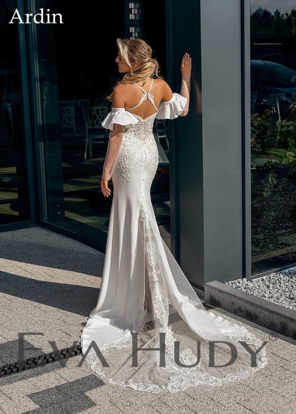 To krepowa, rybka z gładkim dołem i subtelnymi rękawkami. Podkreśla swoim fasonem harmonie i piękno kobiecych kształtów oraz kończy się, eleganckim trenem.