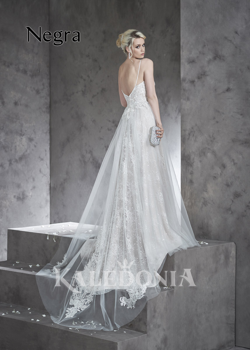 Suknia Negra to wyjątkowa kreacja ślubna o fasonie literki A. Dopasowana góra z kwiatowej koronki, z modnymi, cieniutkimi ramiączkami i kobiecym dekoltem w kształcie literki V, płynnie przechodzi w piękną, rozłożystą, lekko połyskującą spódnicę, przykrytą delikatnym tiulem. Uroku dodają długi tren ozdobiony aplikacjami, który można wygodnie podpiąć i dziewczęce rękawki zakładane osobno na przedramiona.